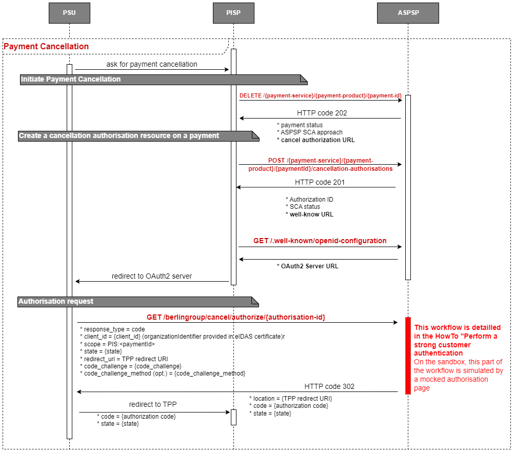 Asks for payment cancellation at the ASPSP for a given payment (giving id, service and product). Specificities for this API and available services and products are listed in the dedicated HowTo.